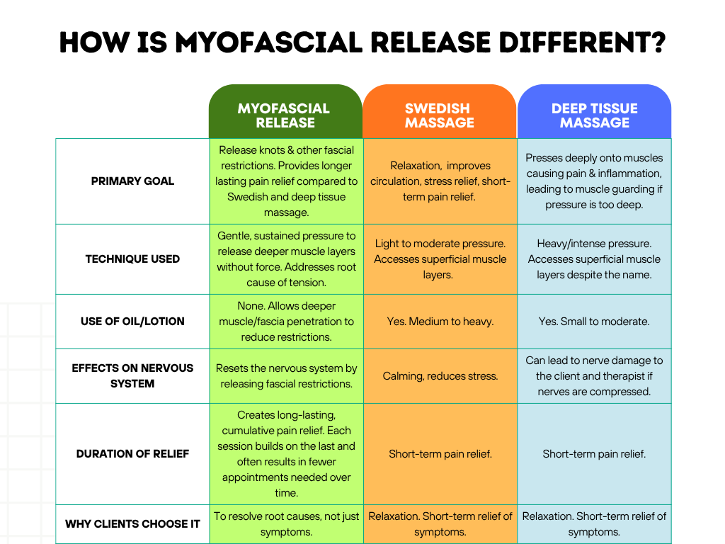 At Precision Myofascial Therapy Clinic, we approach pain relief differently. Lasting results don’t come from heavy, indiscriminate pressure. They come from precision, advanced training, and a clear understanding of how the body responds to touch. We do not offer Swedish or deep tissue massage. Those methods are designed for relaxation or temporary relief. Our focus is clinical care using Myofascial Release, a hands-on technique that targets the connective tissue to create measurable, lasting change in the body.